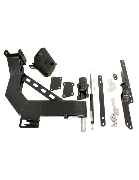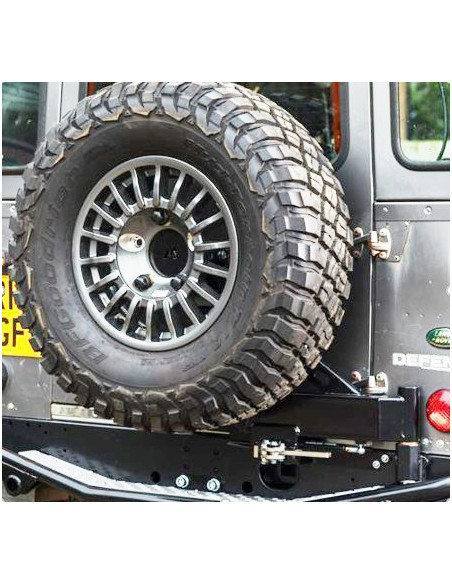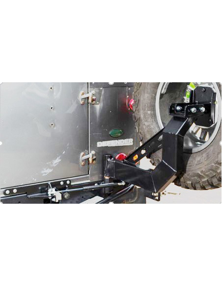 El portaruedas TF059 se monta directamente en el chasis y es ideal para todos los modelos Defender clásicos, incluyendo camionetas y station wagon, donde se prefiere abrirlo independientemente de la puerta trasera o el portón trasero. Este portaruedas de un solo brazo presenta un diseño elegante y se mantiene cerrado mediante una ingeniosa palanca de bloqueo central. Además, se abre con un amortiguador de gas, esencial en pendientes laterales, para evitar que el portaruedas se cierre por su propio peso y para facilitar el acceso a las camionetas.
